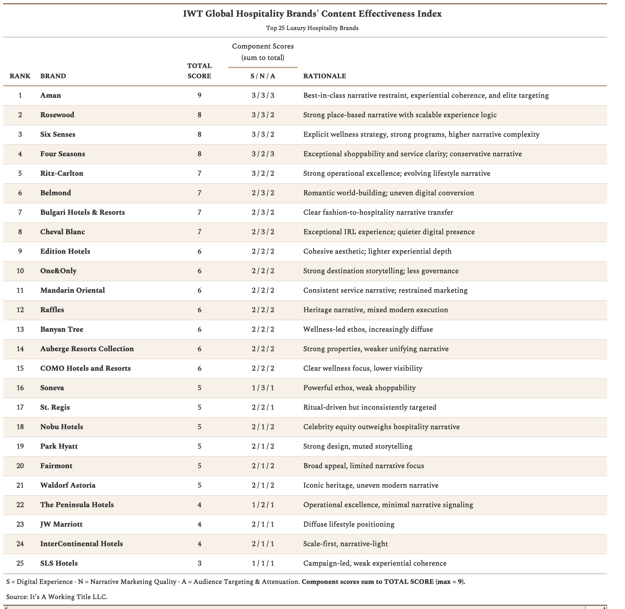 For a practical take, we explore these ideas through brief but focused case studies on the different ways in which Aman builds holistic, culturally contextualised worlds around wellness that seep through their guest experience and operations to varying degrees of success. This analysis draws on the inaugural It’s A Working Title Content Effectiveness Index (CEI) for hospitality, which evaluates luxury brands based on narrative coherence, experience design, and audience clarity.