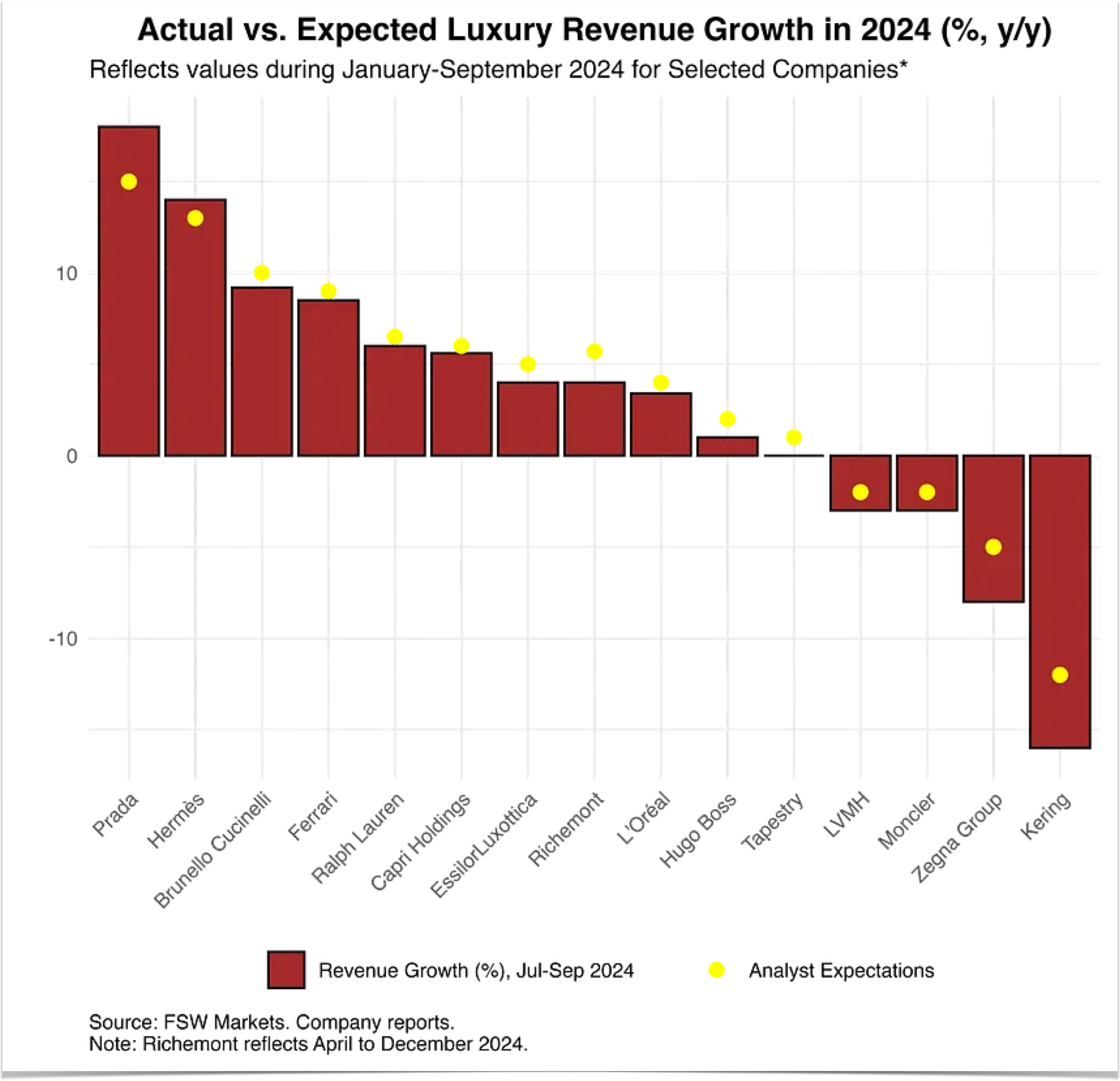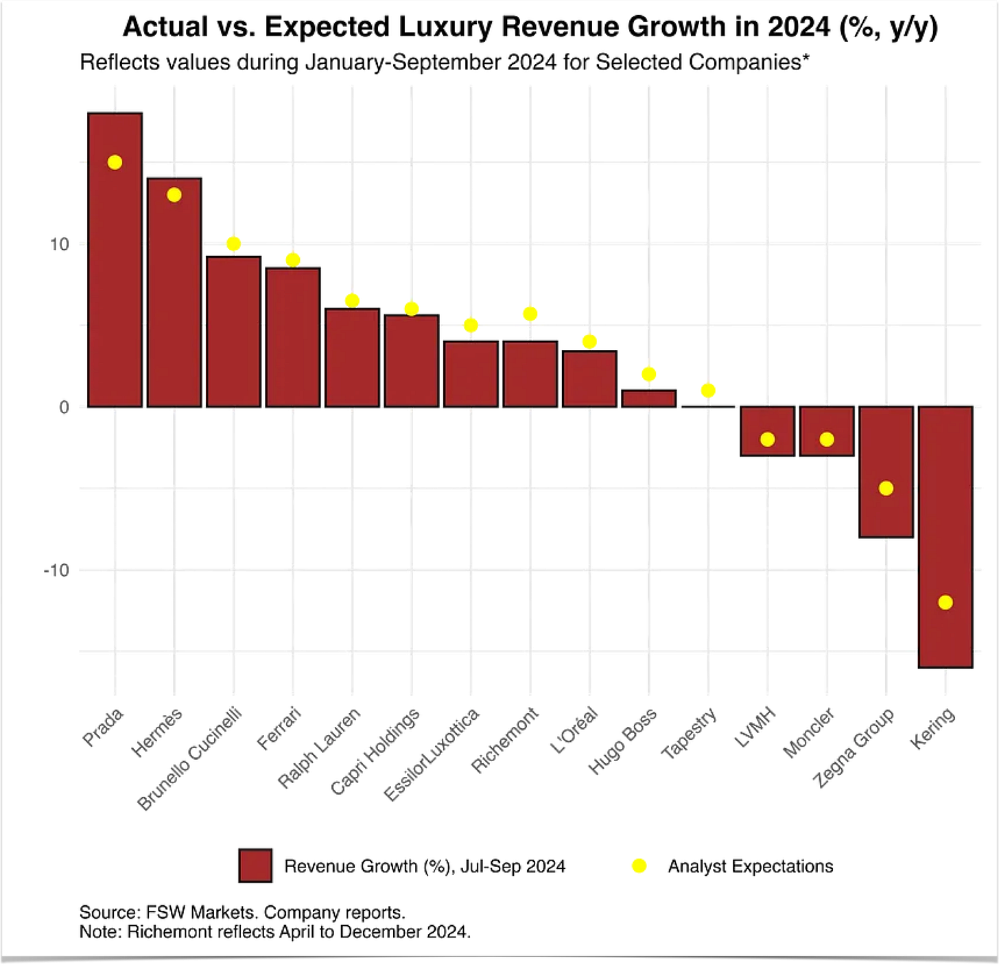 The problem with these figures is that aggregates and central tendencies, such as weighted industry averages, mask the high degree of differentiated performance across luxury brands in 2024. A better and more nuanced look at the industry reveals that while there was an aggregate industry slowdown, there were big winners and big losers last year.