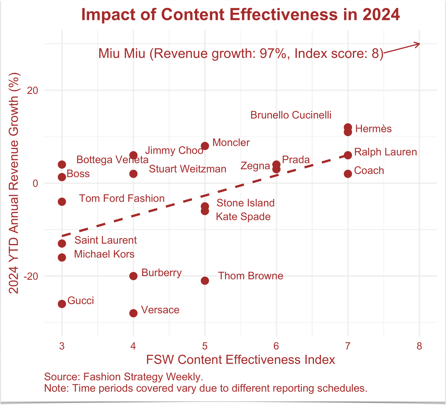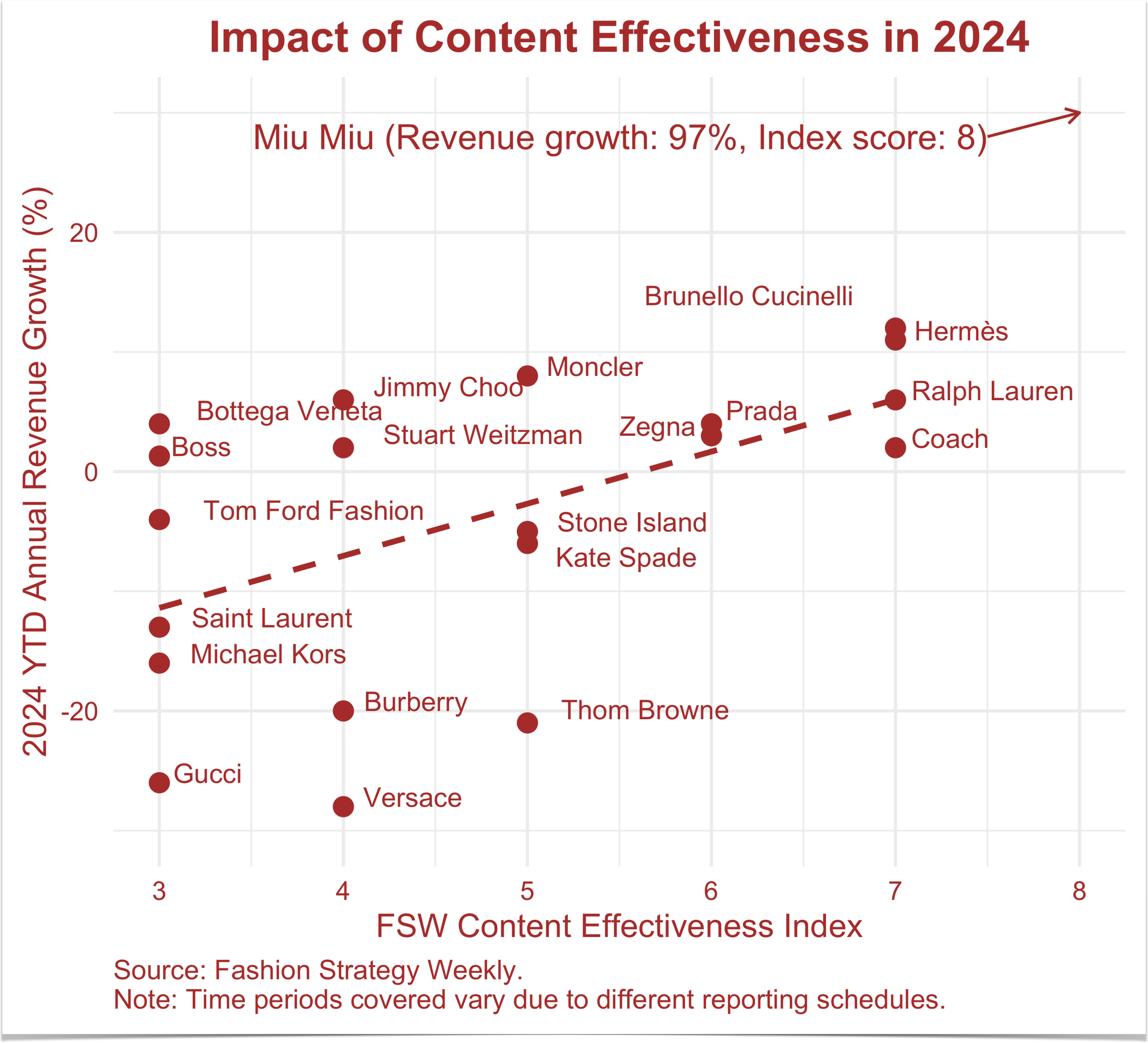 However, to what degree does the efficacy of a fashion or luxury brand’s content across channels correlate to its top-line revenue growth? This is a question the FSW and FSW Markets teams have been thinking about for a while; but, we have not been able to draw meaningful conclusions because we lacked substantial data. So, we built our own index to compare the relationship between a proprietary measure of brands’ content effectiveness and their top-line revenue growth—i.e. the YTD percentage of revenue change from 2023 to 2024. We approached this index with a simple theory: the brands winning with content are winning with consumers, which is revealed through their revenue growth.