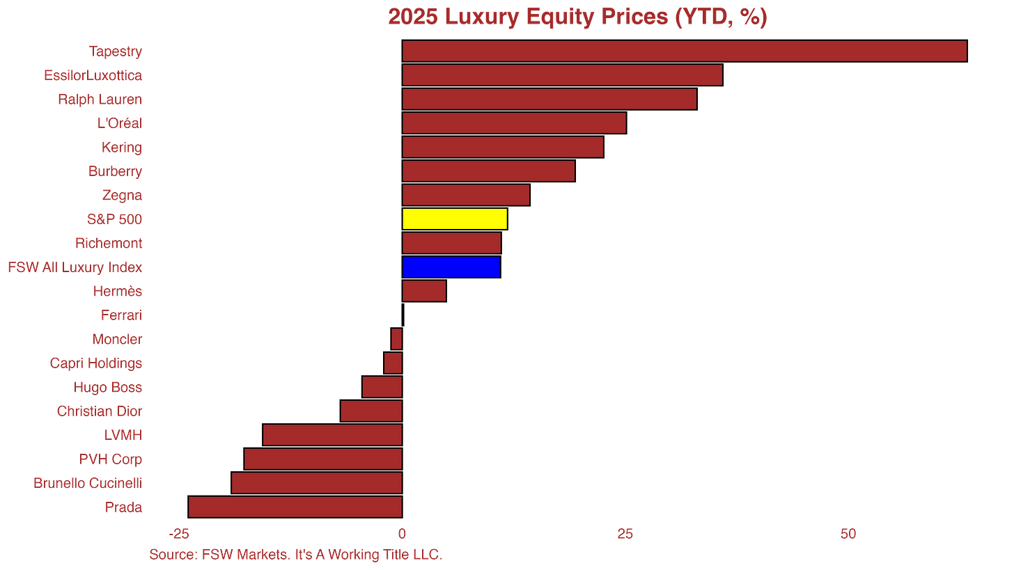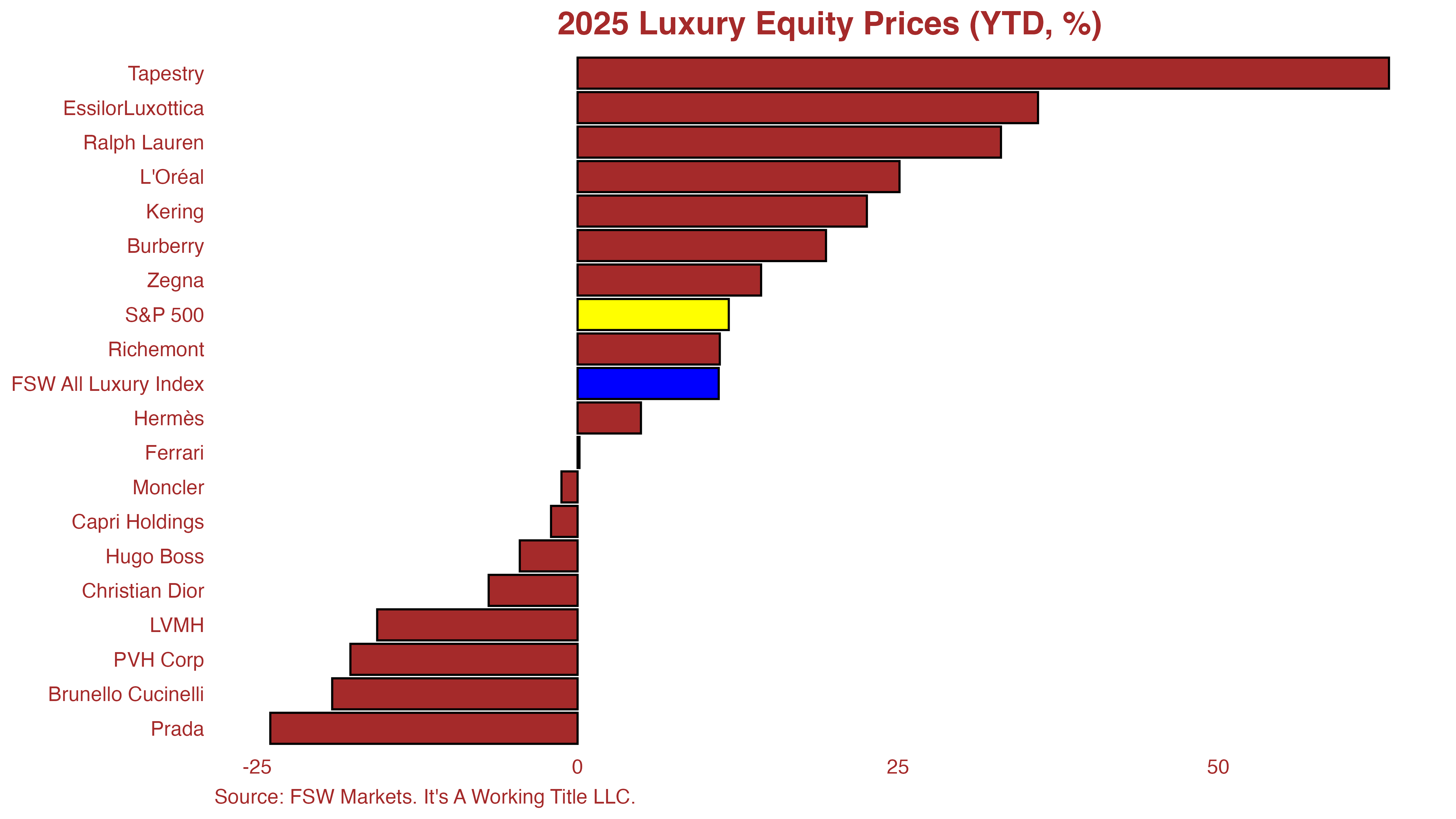 The FSW Markets All Luxury Index is up over 14 percent this year. This compares with a nearly 10 percent decline in 2024. Fifteen of the index’s eighteen constituents are up, led by Richemont (up around 25 percent YTD) after their strong Q3 report, Burberry (up around 18 percent) after a better-than-feared full-year 2024 report and enthusiasm for its new strategic direction. Industry giant LVMH, which comprises around a third of luxury fashion revenues, is up over 17 percent as investors hope that the doom and gloom surrounding the industry last year has begun to lift as hopes that American consumers will help fill the void left by China’s luxury shoppers.