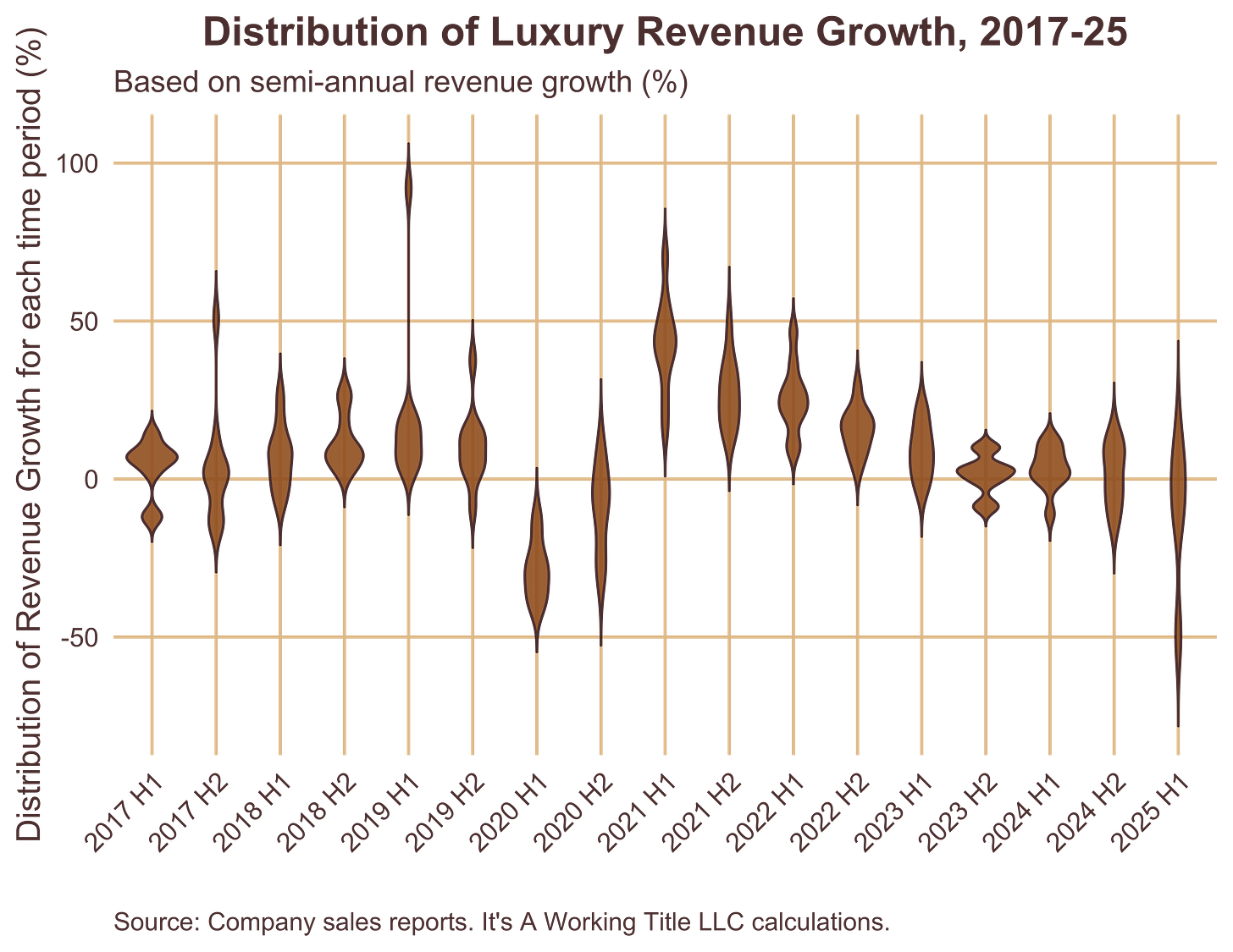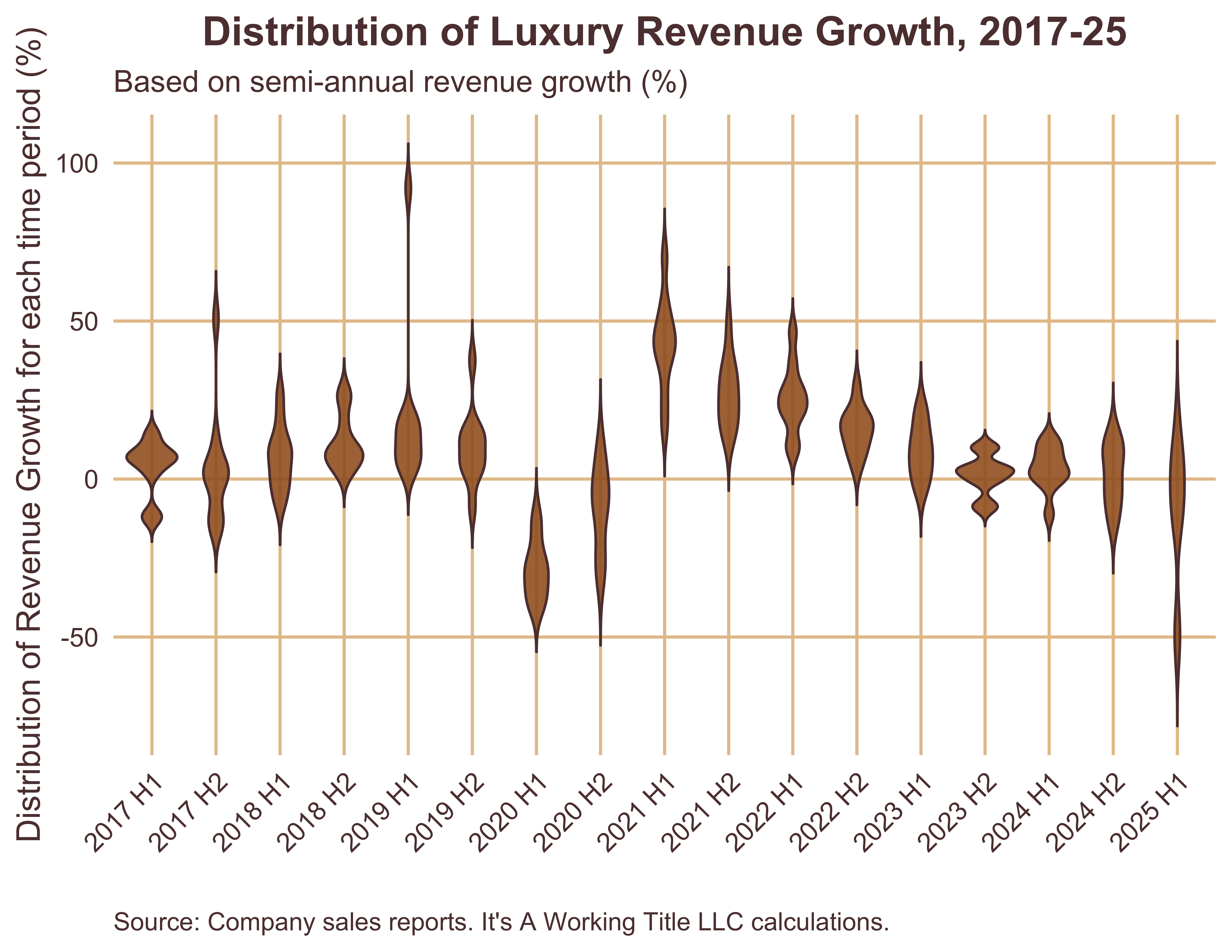 Yet, as we saw in the revenue numbers for the latest quarter, the slowdown is not universal. In fact, there has never been a period in recent history when performance by luxury brands has been so heterogeneous. To get a sense of the heightened level of dispersion in performance, we created a violin plot below, which illustrates how luxury firms’ revenue growth was distributed across the industry from 2017 to the latest results in 2025. The vertical axis shows revenue growth in percentage terms for the luxury firms in our sample, while the width of the “violin” indicates the number of firms with results at that level. Taller, stretched violins indicate that firms’ performances were more scattered, while shorter, wider ones suggest they were more similar. The violin for the last two quarters is the longest over this nine-year period of time, and the thinness shows that there is relatively low clustering of similar results.