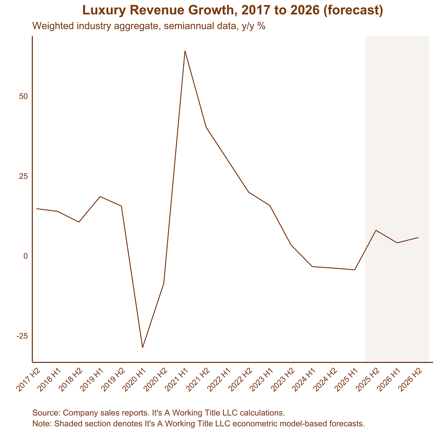 At the industry level, luxury remains in recession. The plot below shows annual revenue growth for a weighted index of major luxury organizations. The plot displays a fairly lengthy time series that encompasses semi-annual growth before, during, and after the pandemic, and includes the It’s A Working Title LLC industry forecasts for the period from H2 2025 to H2 2026. The industry has reported negative revenue growth for about six consecutive quarters. By our count, the only other instance of this occurrence was during and after the 2008 global financial crisis. This is a historically unique slowdown.