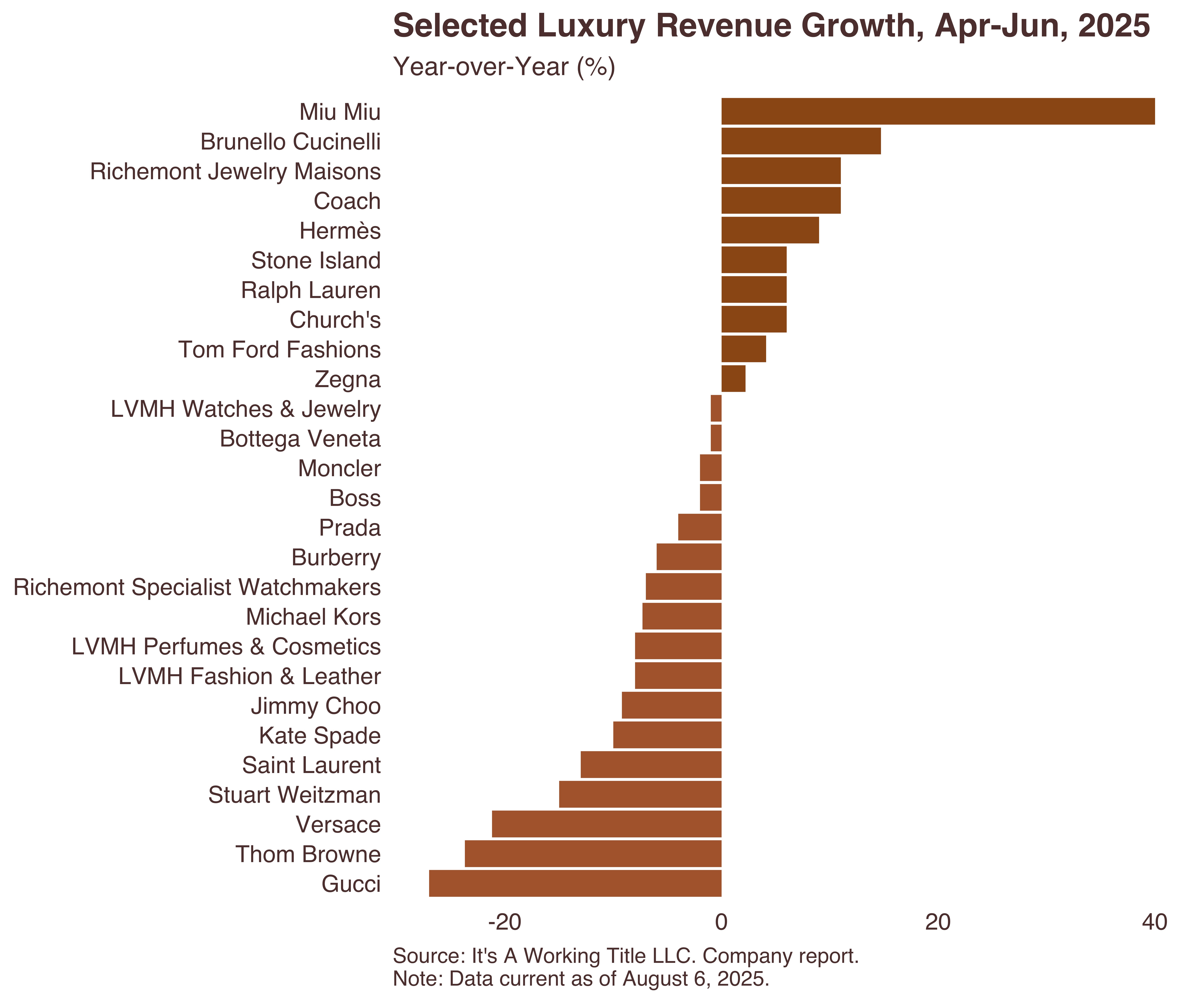 Below we show annual revenue growth for the period of April to June 2025. (You can find our analysis for the full year 2024 and January to March 2025, which provides a similar comparison.) We cover 24 different public brands or quasi-brands. As LVMH and Richemont do not report individual brand data separately, we pulled out some high-level product categories that are reported: LVMH watches and jewelry, LVMH perfumes and cosmetics, LVMH fashion and leather goods, Richemont jewelry, and Richemont specialist watchmakers. This results in something different than a pure apples-to-apples comparison with the other brands (which themselves may be a mix of different types of products), but this is better than nothing and seems necessary given that LVMH and Richemont represent around 35 and 10 percent of the industry, respectively.