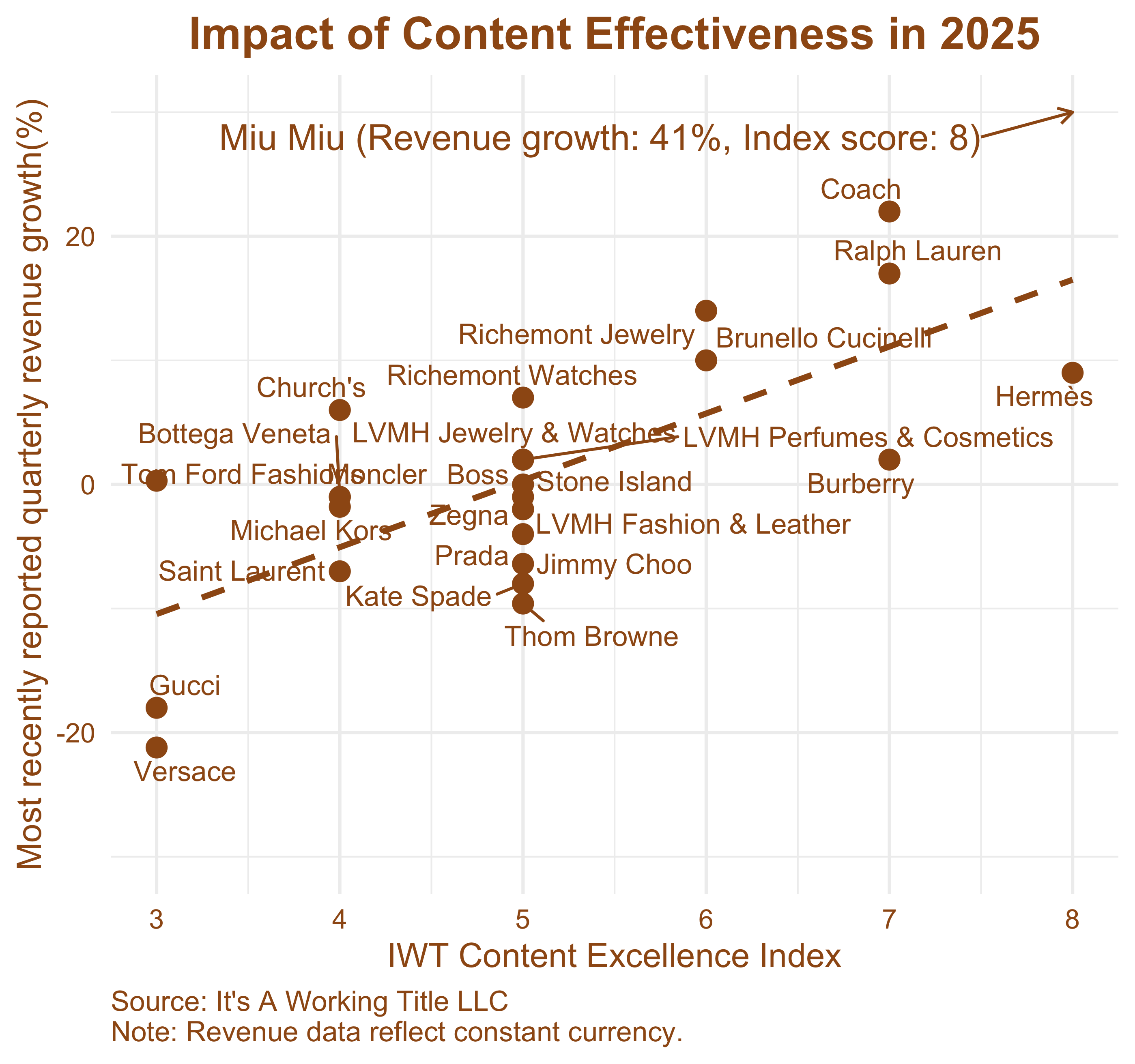 The most recent CEI results, presented in the scatterplot below, reinforce the trend towards pronounced differentiation between brands, rather than industry-wide progress. Only five brands achieved scores above 7: Miu Miu (8), Hermès (7), Coach (7), Burberry (7), and Ralph Lauren (7). These leaders operate from advanced, systematised narrative frameworks, not only excelling creatively but embedding coherence operationally at scale. As the positive correlation between our index and sales growth implies, consumers have rewarded these brands.